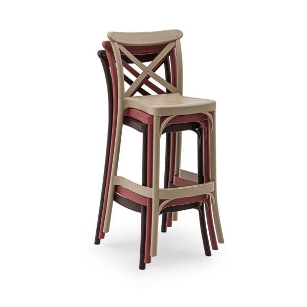 Venge dış mekan bahçe bar sandalyesi, 75 cm oturma yüksekliğiyle, gaz enjeksiyon teknolojisi kullanılarak CATAS sertifikalı malzemeden üretilmiştir. Polipropilen cam elyaf katkısıyla güçlendirilmiş olan bu sandalye, beyaz, bej, nil yeşili, venge, siyah ve ahşap renk seçenekleri sunarak çeşitli dekorasyon tarzlarına uyum sağlar. İç mekanlarla uyumlu olduğu kadar dış mekanlarda da kullanıma uygundur.